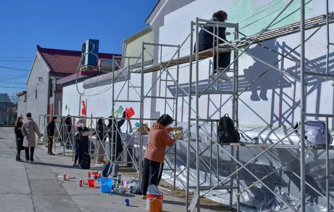 11月10日-11月12日,美术学院50多名师生全部上阵,围绕“石榴花开,籽籽同心”的主题进行绘画,克服夜间工作、天气降温等不利因素分工协作,5个墙绘点全面开花,勾轮廓、调颜料、涂色彩,用色彩亮丽、生动形象的墙绘方式展现新时代北京乡村振兴和民族团结的风貌,高质量完成墙体彩绘260平方米。