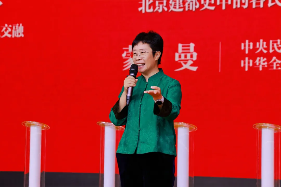 开幕式上,中央民族大学教授、中华全国妇女联合会兼职副主席蒙曼围绕本次展览主题作主旨发言,她强调北京建都是各民族共同努力的结果,中华文明具有突出的连续性,北京的都城文化是我们各民族共同创造的。