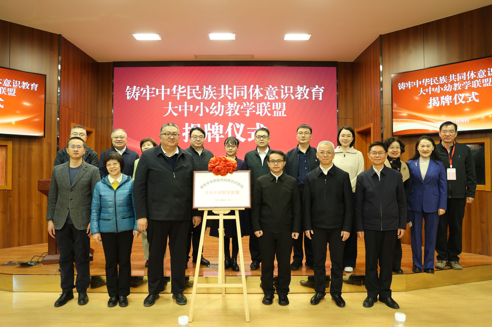 与会领导共同为教学联盟揭牌,标志着铸牢中华民族共同体意识教育大中小幼教学联盟正式成立。