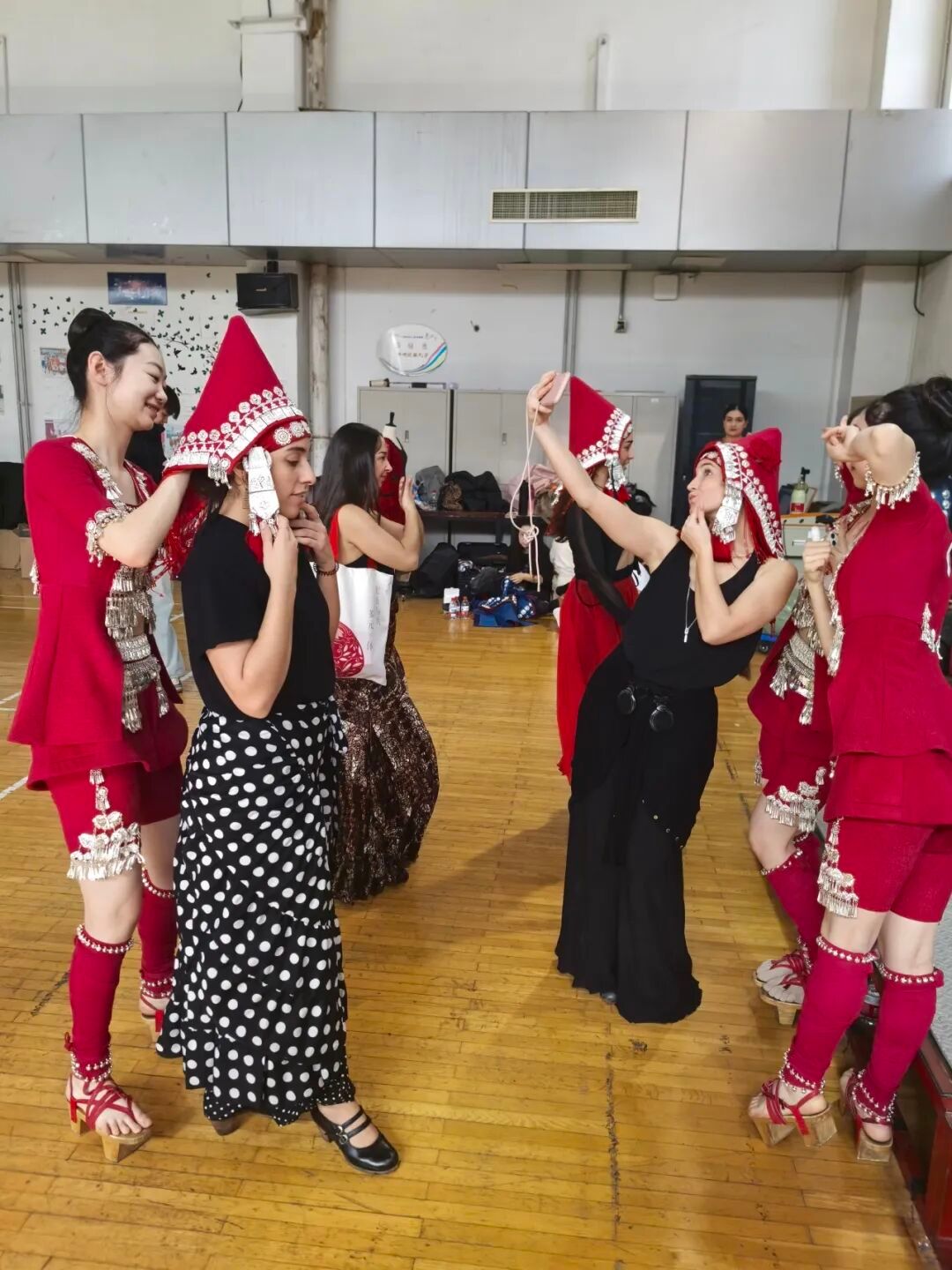 民族服饰,也是文化的直接载体。在排练间隙,中外舞者们兴致盎然地交换穿上演出服饰,互相感受不同的文化氛围。西班牙舞蹈演员戴上了有银饰坠边和鲜艳花朵的红色尖顶帽饰,还试穿了中国民族演出服拍照留念。天下大同、世界一家的美好愿景在这些珍贵的时刻闪耀。