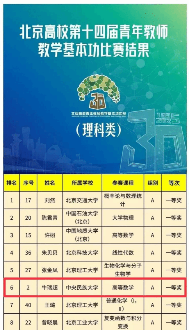 牛瑞超的育人脚步,从未止步于三尺讲台。她说:“实践与挑战是激发创新潜能的最好催化剂。”近年来,牛瑞超将教学延伸到了学科竞赛指导与学生科研训练中。在她的悉心指导下,民大学子在全国大学生数学竞赛中屡获殊荣,近两年累计荣获北京赛区一等奖6项、二等奖16项。她也在2025年荣获“北京赛区优秀指导教师”称号。