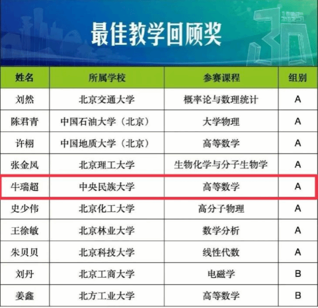新闻网讯 近日,在北京高校第十四届青年教师教学基本功比赛中理学院教师牛瑞超,以高等数学中《曲面的面积》一节作为参赛内容,荣获理科类一等奖,并荣获“最佳教案奖”与“最佳教学回顾奖”两项单项奖。