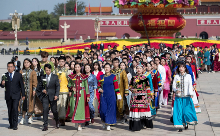 国庆70周年庆祝活动中参加民族团结方阵的各族学生