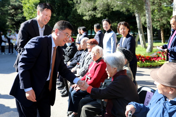 从1951到2021,七十年栉风沐雨,七十年春华秋实,更改的是青春岁月,留下的是挚爱真情。老同志、老校友们作为学校建设发展的亲历者和见证者,为学校发展进步付出心血,离退休后老而弥坚,以不同方式始终关心关爱学校发展建设,为在校师生树立了榜样、为学校发展留下了宝贵财富。他们都已是耄耋之年,年纪最大的陈其光学长已96岁高龄,最“年轻”的赵金燕和张守玉学姐也都已88岁高龄,但他们对母校的深情、对师长的感恩、对祖国的赤诚,通过返校的举动和朴实的话语,令人感佩。“我们是在国子监上过课、在雍和宫大殿住过宿的第一级学生,可以说经历了建校初期最困难阶段,但也见证了民大改革发展取得的成绩。我们看着海淀校区建设起来,前段时间我又去丰台校区看了看,建设得真好!”荣誉资深教授、博士生导师,1951年中央民族学院成立时的第一届学生,91岁高龄的胡振华学长说,作为一名老校友、一名老教师,为学校70年来所取得的辉煌成就感到骄傲,祝福学校越来越好。他寄语新时代大学生要继承学校优良传统,传承民大红色基因,知校爱校荣校,德智体美劳全面发展,做合格的社会主义事业的建设者和接班人。
