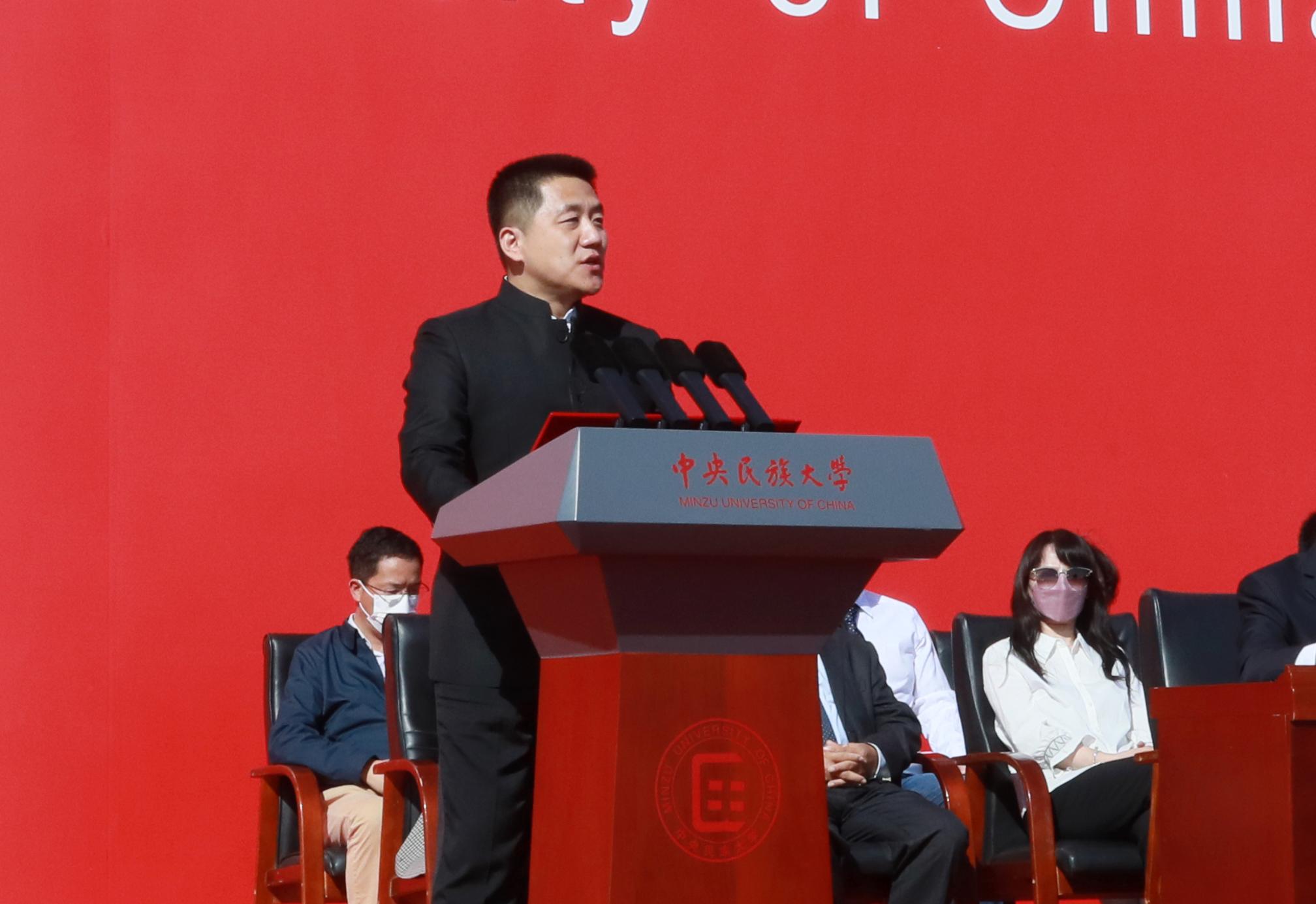 受张京泽书记委托,郭广生校长代表中央民族大学2万余名师生员工,热烈欢迎和衷心祝贺新民大人,勉励同学们能够在中央民族大学这一方沃土上汲取知识营养,得到智慧启发,积聚成长内能,练就钢筋铁骨,绽放魅力芳华。