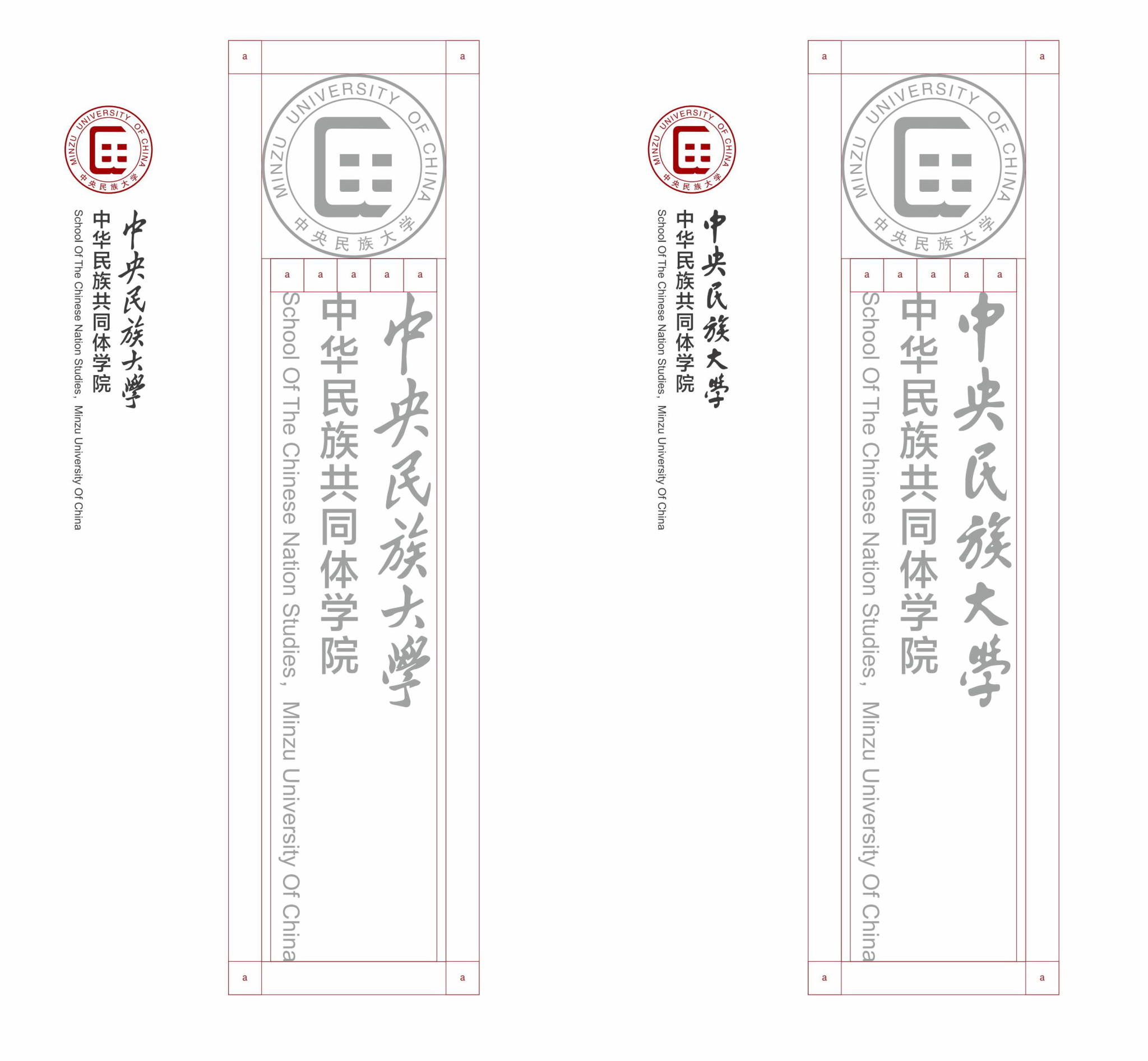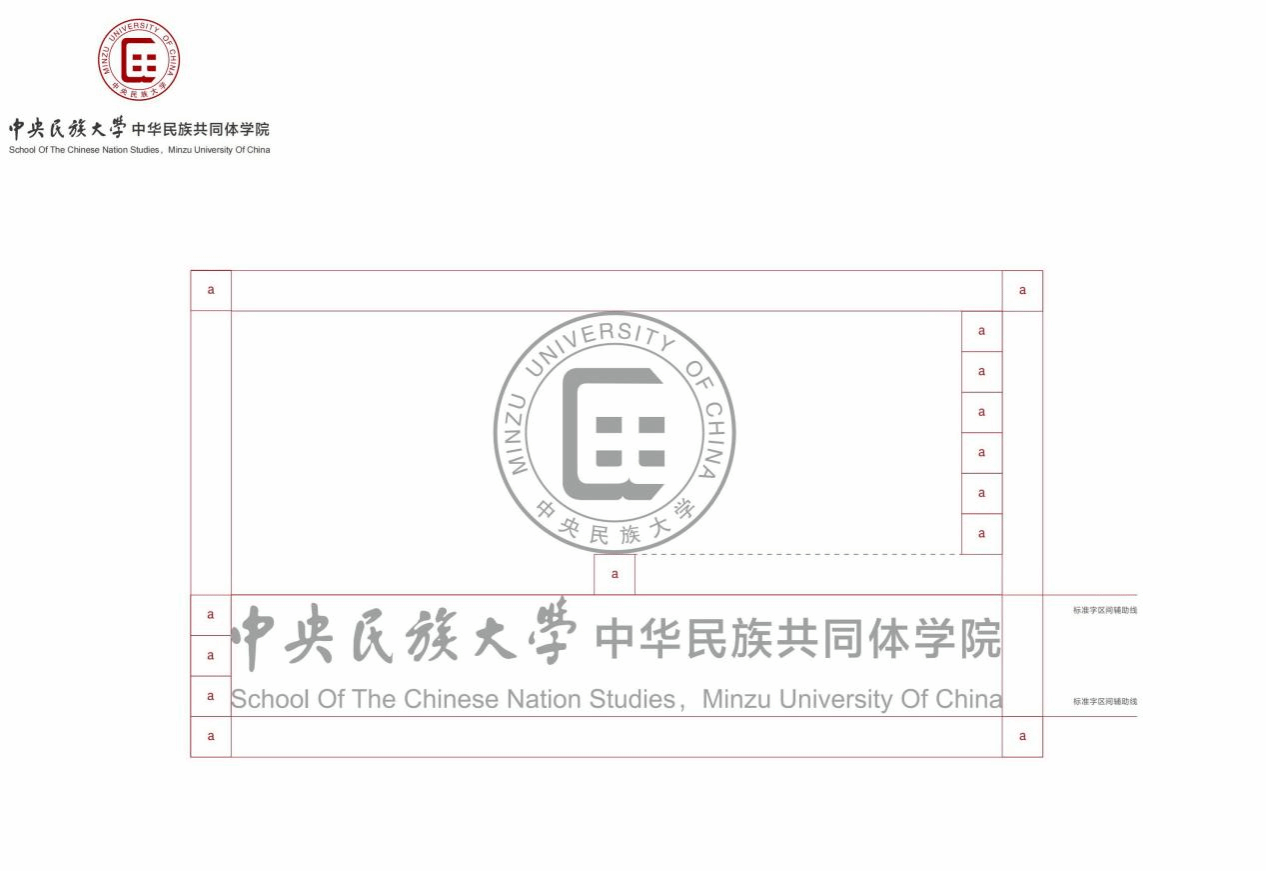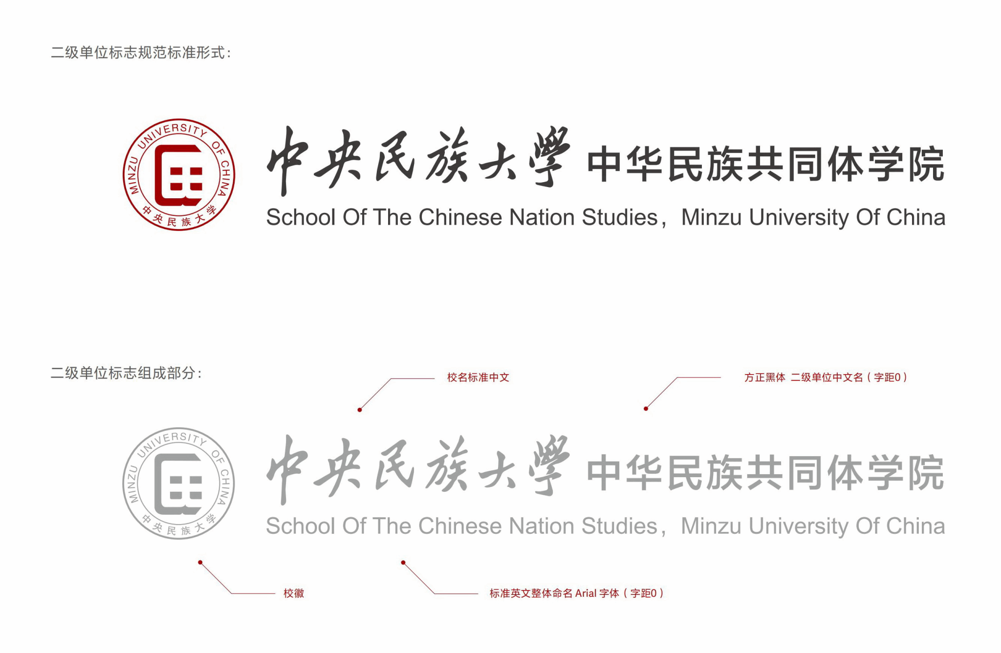 标志中校徽应使用学校提供的规范矢量制图文件,标准色彩为民大红;标志中“中央民族大学”的标准字体(毛体字和江泽民同志题写的“中央民族大学”中文标准字并行使用)应使用由学校提供的规范矢量制图文件;二级单位名称的中文标准字体为“方正黑体”,英文标准字体为英文“Arial”。